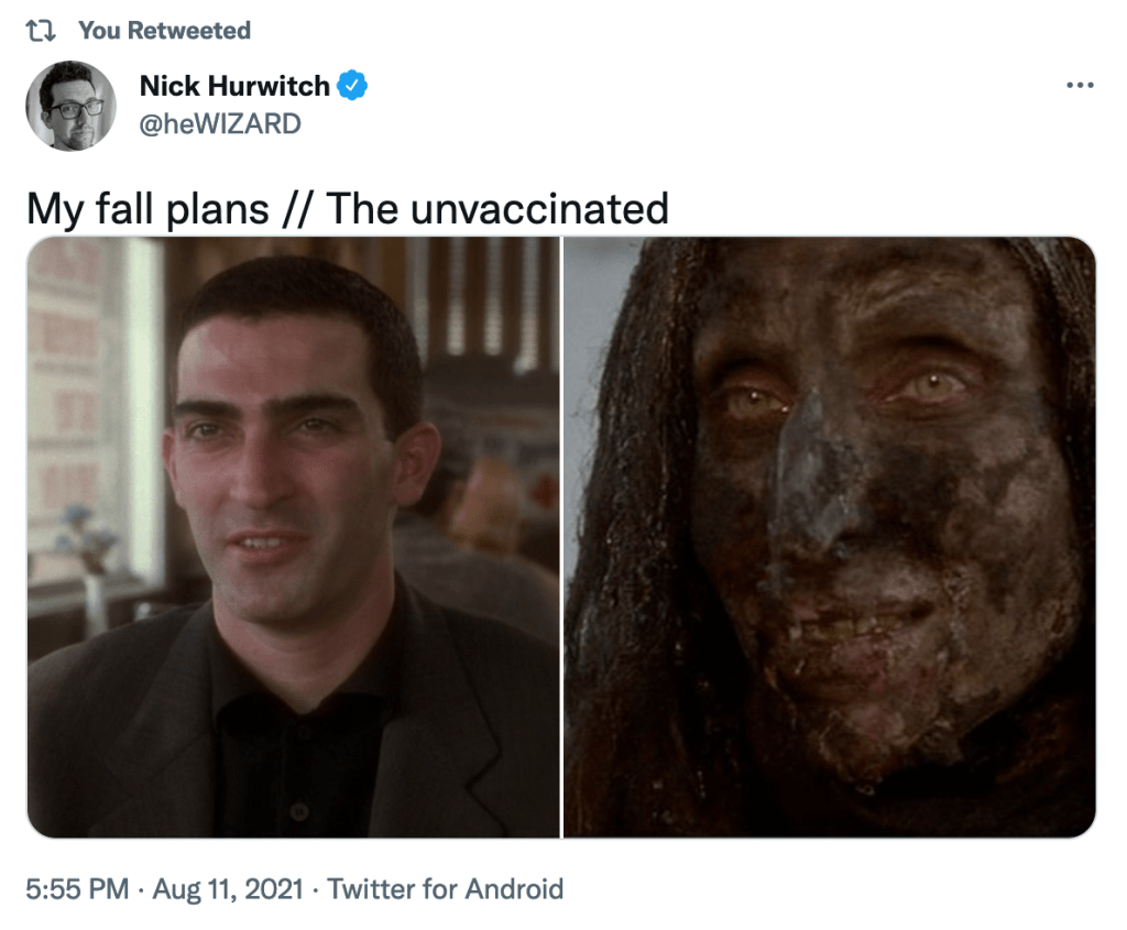 So, yeah, humanity comes together with images from horror movies and scary tv shows to express our dismay that the Corona-virus delta variant is out to get us– talk about collective anxiety.