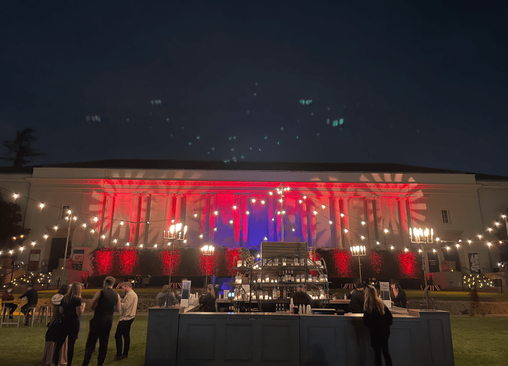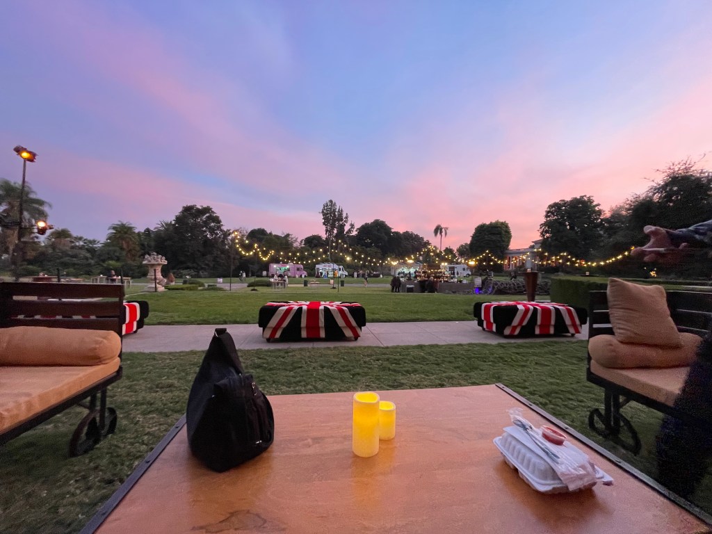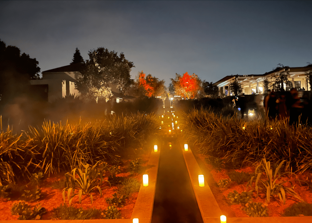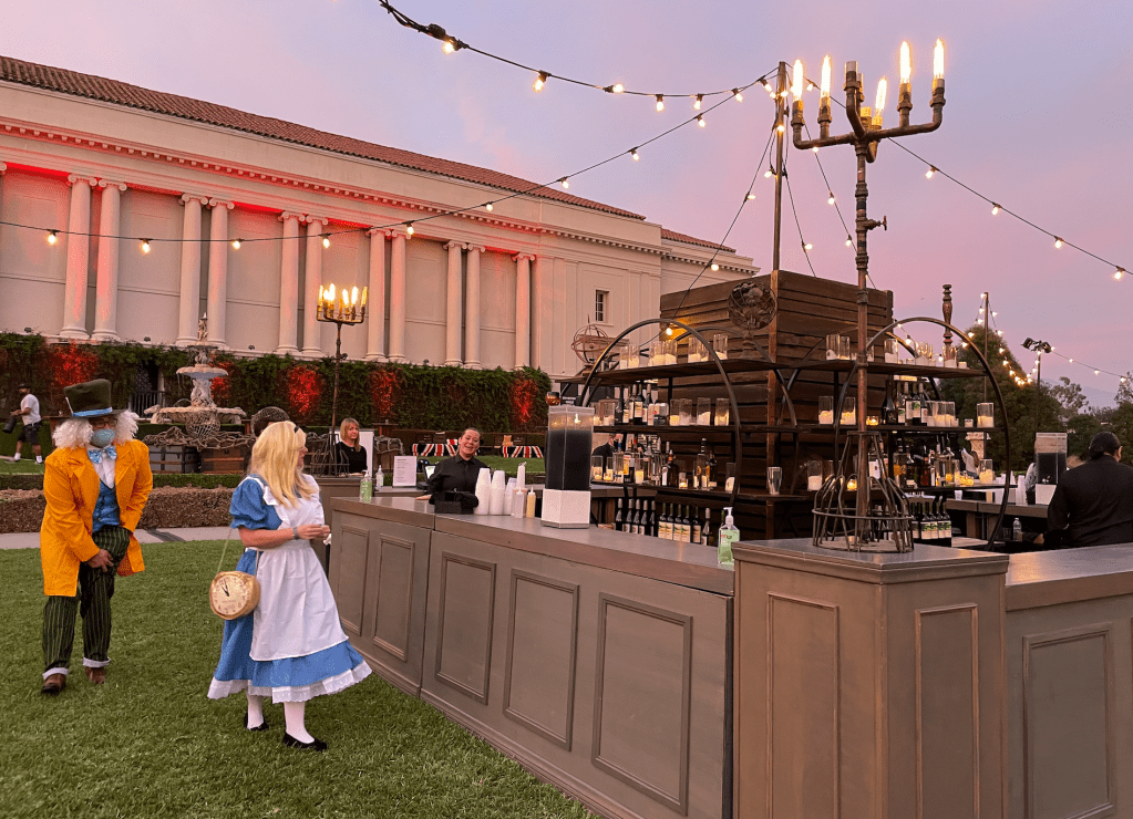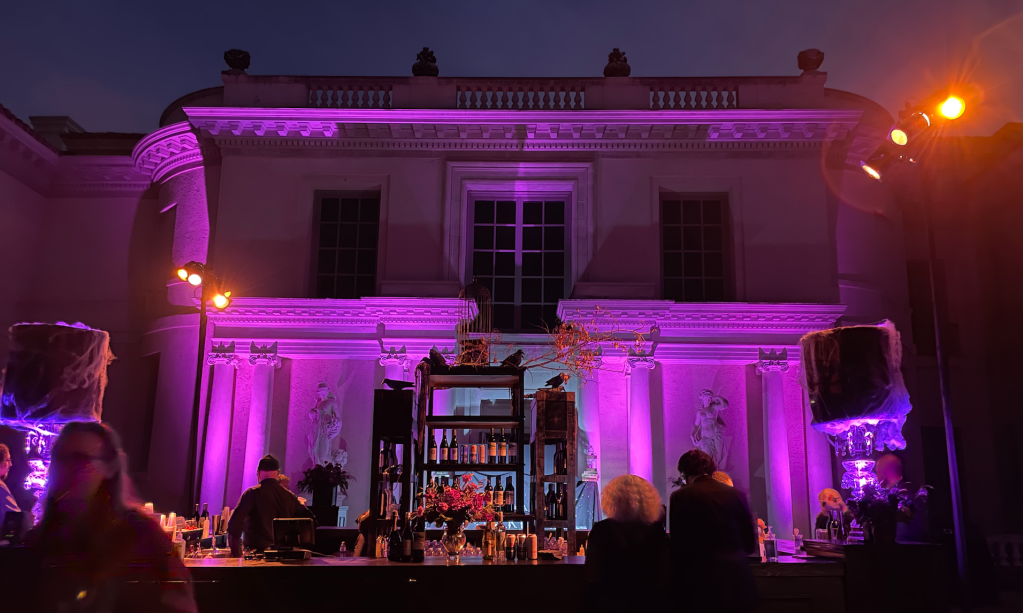 A path leads to various performance stages. Flora and fauna nooks included homages to classic authors of the macabre. The main lawn had a beautifully lit bar and food trunks. The additional bars around the property were beautiful as well.